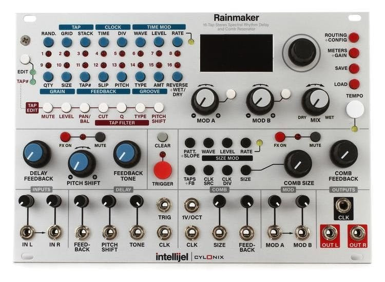 The Intellijel/Cylonix Rainmaker provides a high-quality (96KHz sampling rate with 32-bit internal processing) stereo rhythmic delay and stereo comb resonator effect.